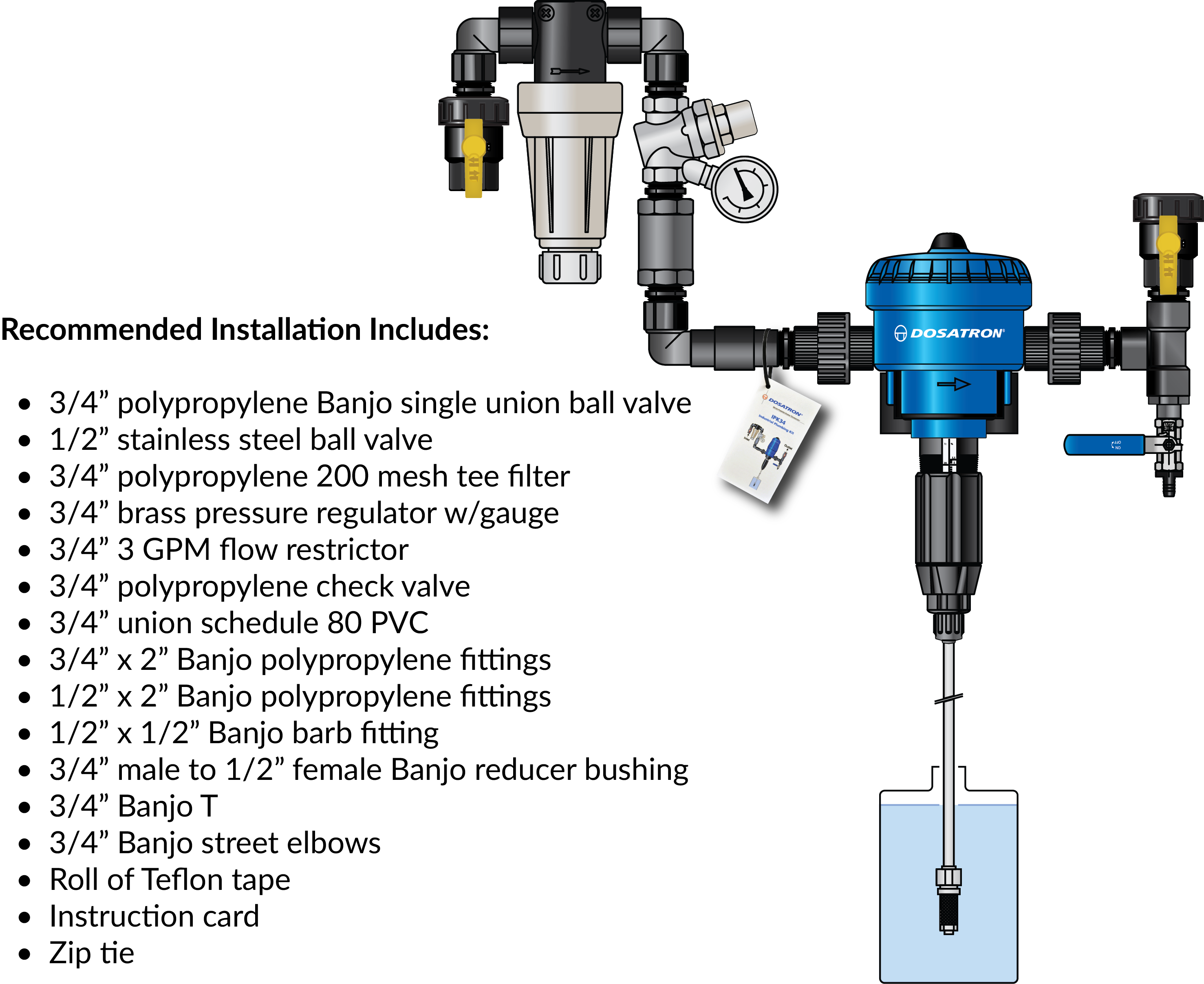 Included Accessories: Mounting bracket, suction hose, weighted strainer, and quick start guide.