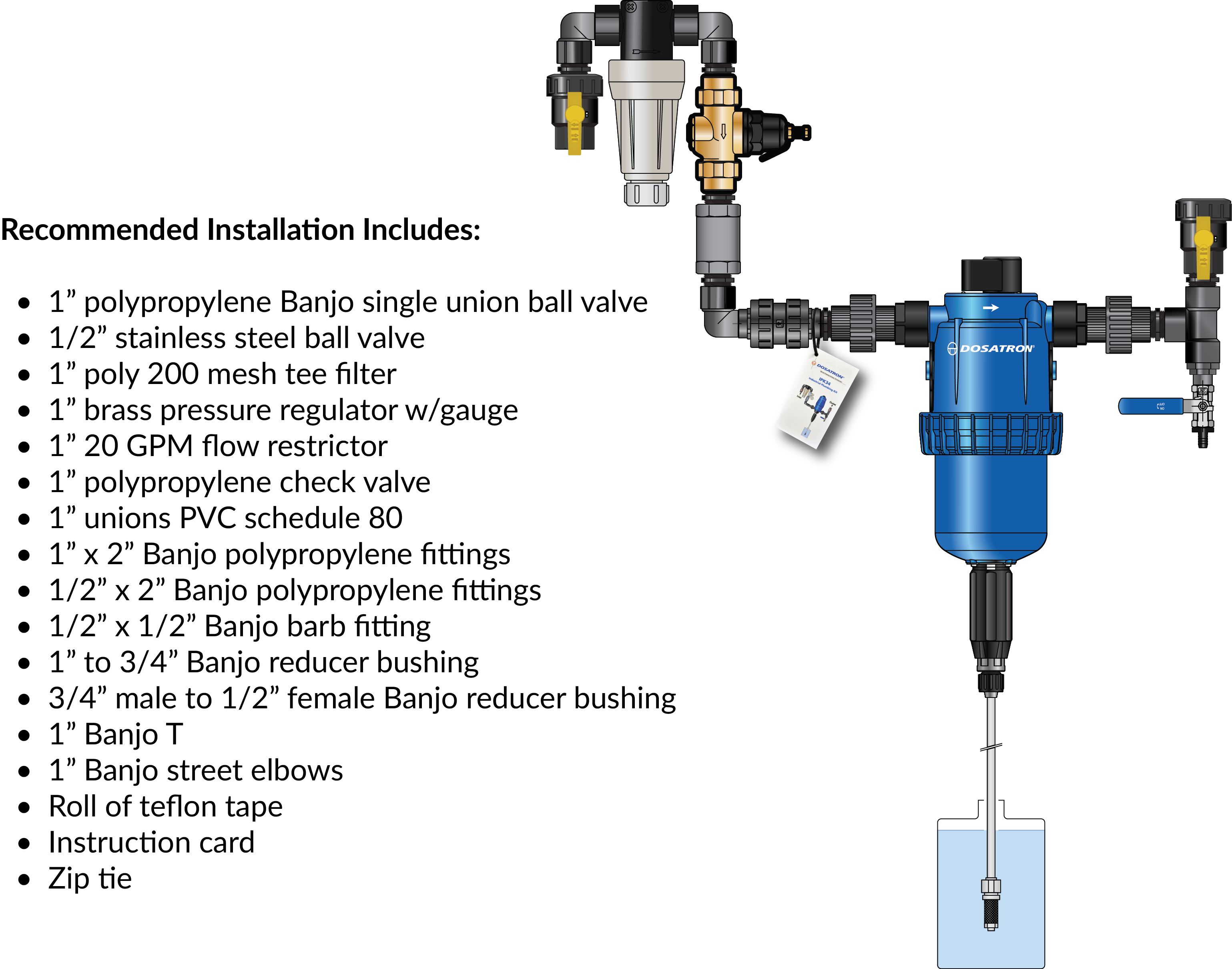 Included Accessories: Mounting bracket, suction hose, weighted strainer, and quick start guide.
